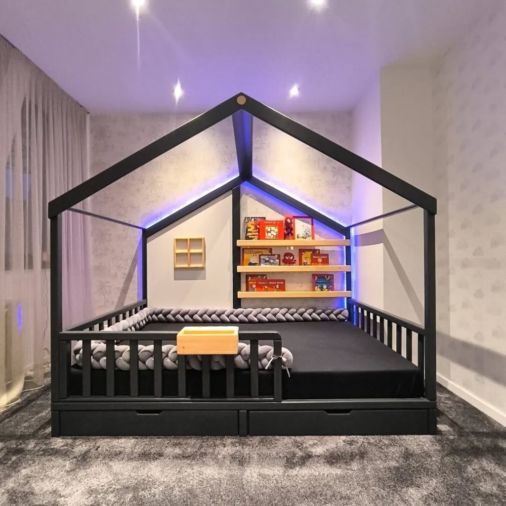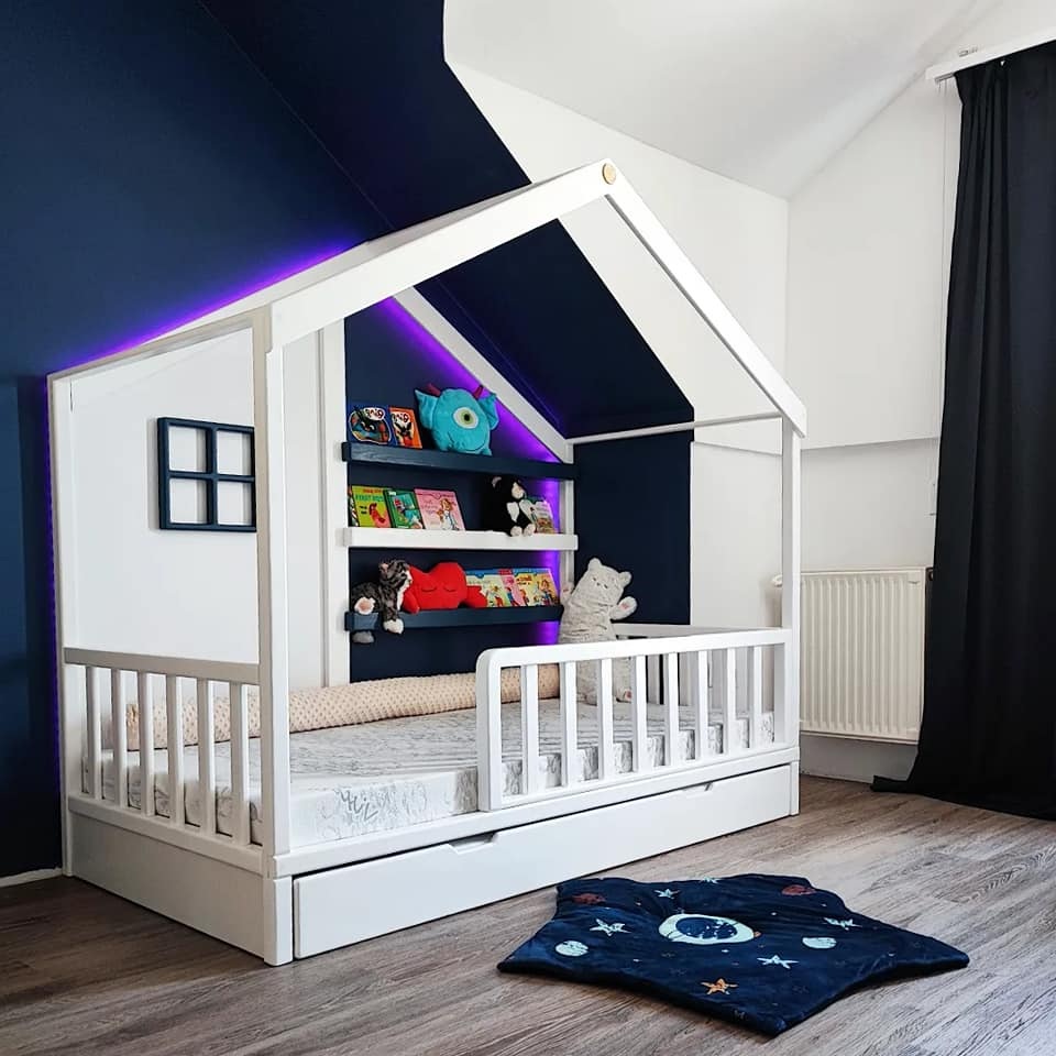 • Egyedi kialakítás és esztétika: A házikó forma nemcsak játékos, de biztonságos is. A magasított oldalfalak megakadályozzák, hogy a gyermek leeshessen álmában, így nyugodtan aludhatnak a szülők is. Az ágy modern és letisztult vonalai könnyen kombinálhatók más bútorokkal és dekorációkkal. A háttérben egy három soros polcrendszer került kialakításra a könyvek és a kincsek tárolására, hogy az esti altatásnál minden kéznél legyen.