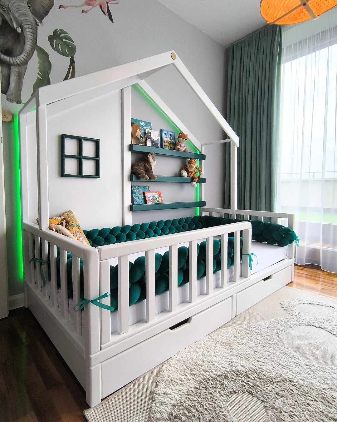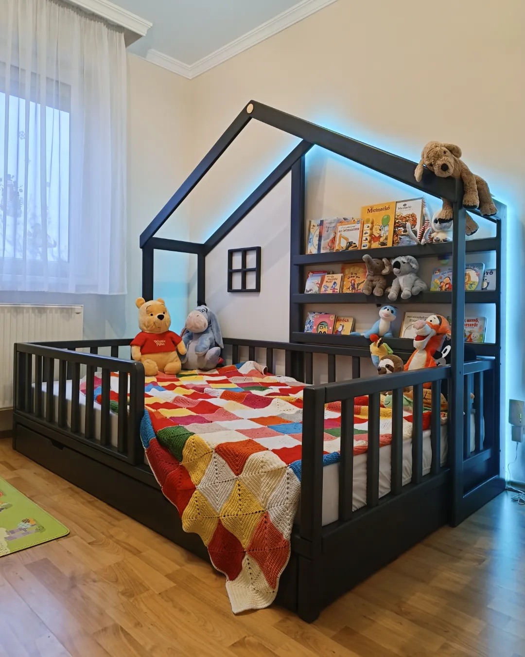 • Egyedi kialakítás és esztétika: A házikó forma nemcsak játékos, de biztonságos is. A magasított oldalfalak megakadályozzák, hogy a gyermek leeshessen álmában, így nyugodtan aludhatnak a szülők is. Az ágy modern és letisztult vonalai könnyen kombinálhatók más bútorokkal és dekorációkkal. A háttérben egy három soros polcrendszer került kialakításra a könyvek és a kincsek tárolására, hogy az esti altatásnál minden kéznél legyen.